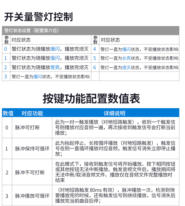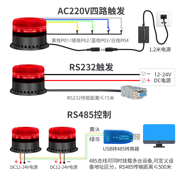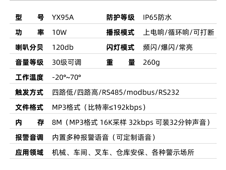 本公司推出的YX95R声光报警器,,,,,,,具有低功耗、长寿命、装置无邪、利便等特点,,,,,,,支持USB自行替换报警语音文件;;;;;;;;本产品有三路开关量控制和modbus485控制两种控制方法可选,,,,,,,可以凭证需求以差别的灯光颜色以及闪灯方法搭配响应的警示语音来抵达警示报警等功效,,,,,,,好比:红色的灯光可以用于在事故现场的声音报警和闪光报警,,,,,,,只要触发即发出闪光信号和声报警信号,,,,,,,让现场职员迅速知道现场已爆发事故或装备故障提醒,,,,,,,尽快接纳响应步伐,,,,,,,阻止爆发重大职员、财物损失;;;;;;;;通过智能控制??????榛箍山尤肼衍智能火灾自动报警控制系统中。。。。。
